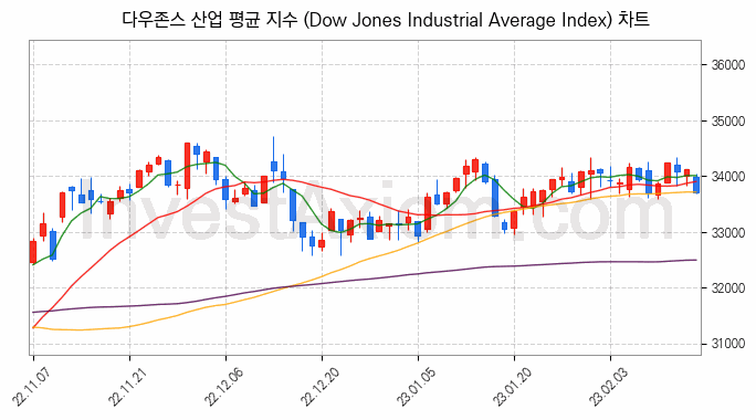 미국 주식 시장 주가 지수 분석, 다우존스산업 나스닥 S&P500 VIX RUSSEL1000 지수 분석 2023-02-10