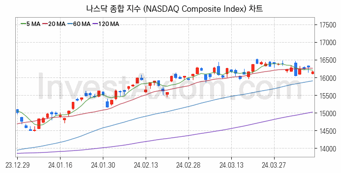 나스닥 종합 지수(NASDAQ Composite Index)는 전 거래일 대비 -136.28포인트 -0.84% 하락한 16170.36이며, 분석 시점 기준으로 전 거래일 상승 후 하락했습니다.