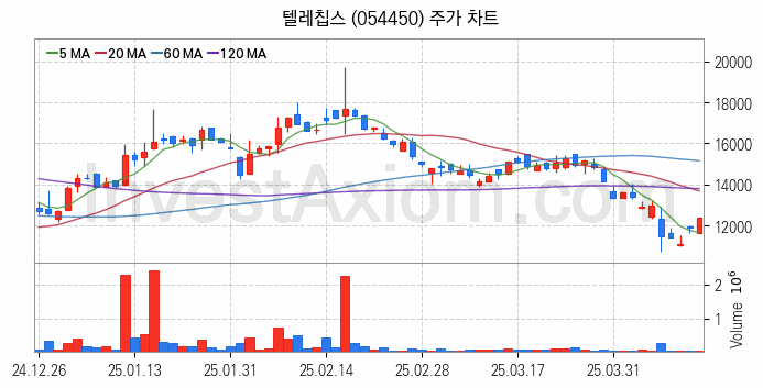 텔레칩스(054450) 종목은 시가 11,610원으로 시작해 12,370원으로 마감했습니다.