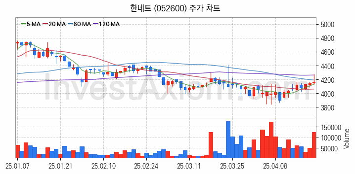 한네트(052600) 종목은 시가 4,150원으로 시작해 4,165원으로 마감했습니다.