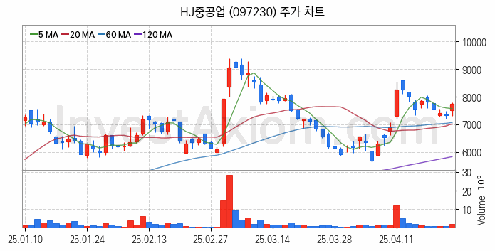 HJ중공업(097230) 종목은 시가 7,500원으로 시작해 7,730원으로 마감했습니다.