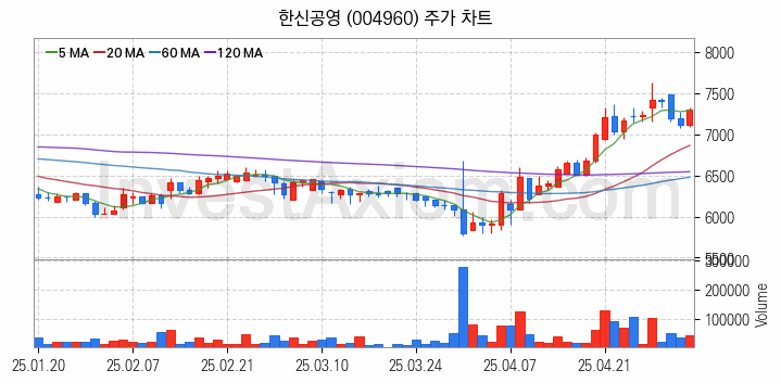 한신공영(004960) 종목은 시가 7,120원으로 시작해 7,300원으로 마감했습니다.