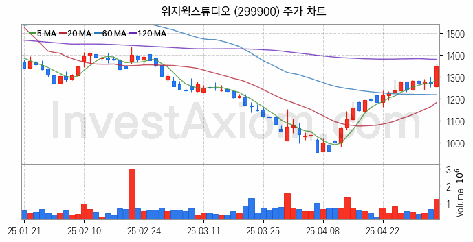 위지윅스튜디오(299900) 종목은 시가 1,259원으로 시작해 1,348원으로 마감했습니다.