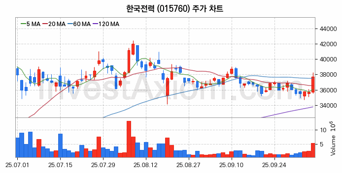 한국전력 주가는 주 단위 첫 거래일인 2025년 10월 13일을 기준으로 주초 주가 35700원 대비 약 5.6% 2000원 상승한 상태입니다.