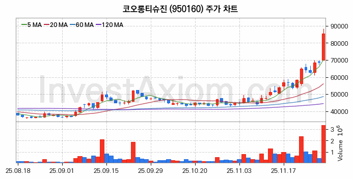 2025년 11월 28일, 코오롱티슈진 주식 종목(950160)의 주가는 전일(68900원) 대비 16500원(약 23.95%) 상승한 85400원입니다.