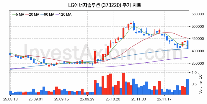 2025년 11월 28일, LG에너지솔루션 주식 종목(373220)의 주가는 전일(438000원) 대비 30000원(약 6.85%) 하락한 408000원입니다.