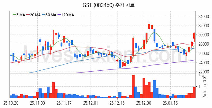 GST(083450) 종목은 시가 29,200원으로 시작해 30,300원으로 마감했습니다.