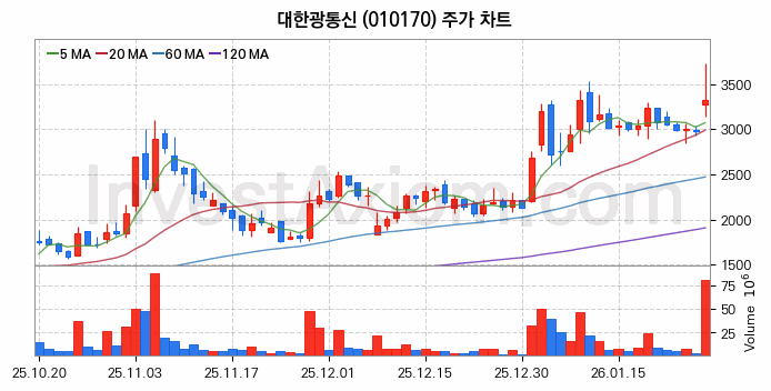 2026년 01월 28일, 대한광통신 주식 종목(010170)의 주가는 전일(2985원) 대비 340원(약 11.39%) 상승한 3325원입니다.