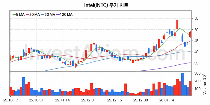 Intel (주식 종목 코드 : INTC, 인텔) 주가 분석 내용의 기준 시점은 2026년 01월 28일이며, 분석 기준 시점으로부터의 주가 흐름 및 거래량 데이터를 바탕으로 분석 한 내용입니다.