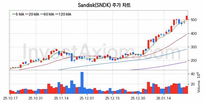 2026년 01월 28일, Sandisk 주식 종목(SNDK)의 주가는 전일(481.42달러) 대비 46.2달러(약 9.6%) 상승한 527.63달러입니다.