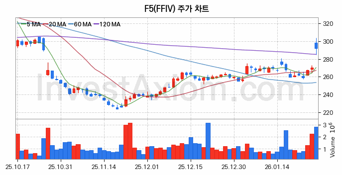 F5 (주식 종목 코드 : FFIV) 주가 분석 내용의 기준 시점은 2026년 01월 28일이며, 분석 기준 시점으로부터의 주가 흐름 및 거래량 데이터를 바탕으로 분석 한 내용입니다.