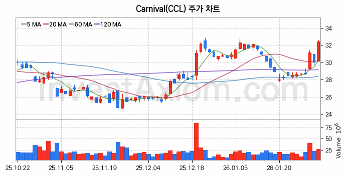 2026년도 첫 거래일인 2026년 01월 02일을 기준으로 분석 시점에서의 카니발 주가는 연초 주가 30.92달러 대비 약 4.95%에 해당하는 1.53달러 상승한 상태입니다.