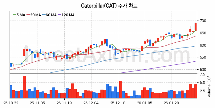 2026년 02월 02일, Caterpillar 주식 종목(CAT)의 주가는 전일(657.35달러) 대비 33.54달러(약 5.1%) 상승한 690.9달러입니다.