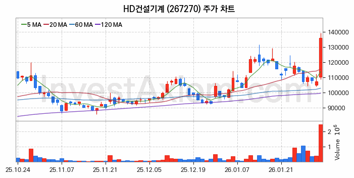2026년 02월 03일, HD건설기계 주식 종목(267270)의 주가는 전일(107300원) 대비 28600원(약 26.65%) 상승한 135900원입니다.