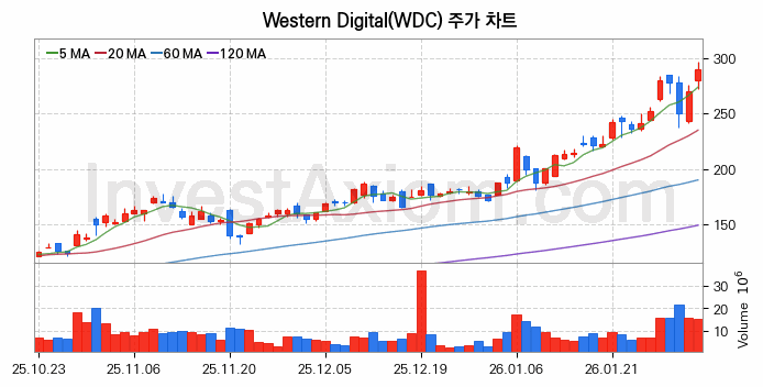 2026년 02월 03일, Western Digital 주식 종목(WDC)의 주가는 전일(270.23달러) 대비 20.0달러(약 7.4%) 상승한 290.23달러입니다.