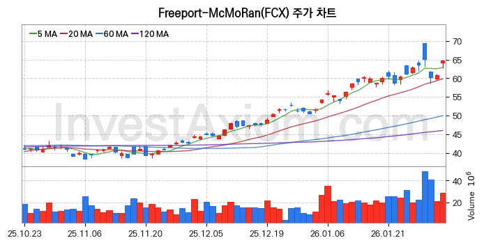 2026년 02월 03일, Freeport-McMoRan 주식 종목(FCX)의 주가는 전일(60.75달러) 대비 3.9달러(약 6.44%) 상승한 64.66달러입니다.