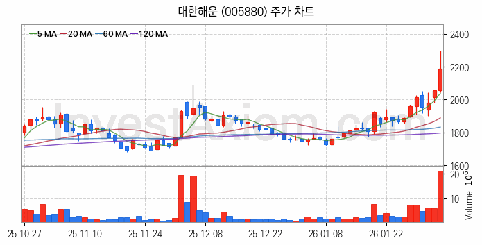 대한해운(005880) 종목은 시가 2,055원으로 시작해 2,185원으로 마감했습니다.
