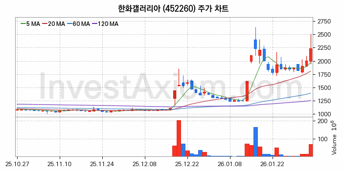 2026년 02월 04일, 한화갤러리아 주식 종목(452260)의 주가는 전일(2005원) 대비 230원(약 11.47%) 상승한 2235원입니다.
