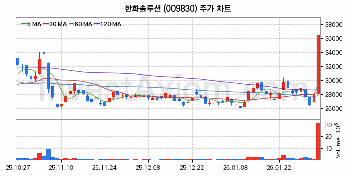 2026년 02월 04일, 한화솔루션 주식 종목(009830)의 주가는 전일(28050원) 대비 8400원(약 29.95%) 상승한 36450원입니다.