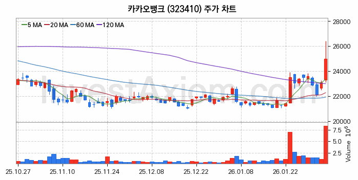 2026년 02월 04일, 카카오뱅크 주식 종목(323410)의 주가는 전일(23100원) 대비 1900원(약 8.23%) 상승한 25000원입니다.