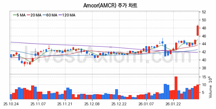 2026년 02월 04일, Amcor 주식 종목(AMCR)의 주가는 전일(44.91달러) 대비 3.64달러(약 8.1%) 상승한 48.56달러입니다.