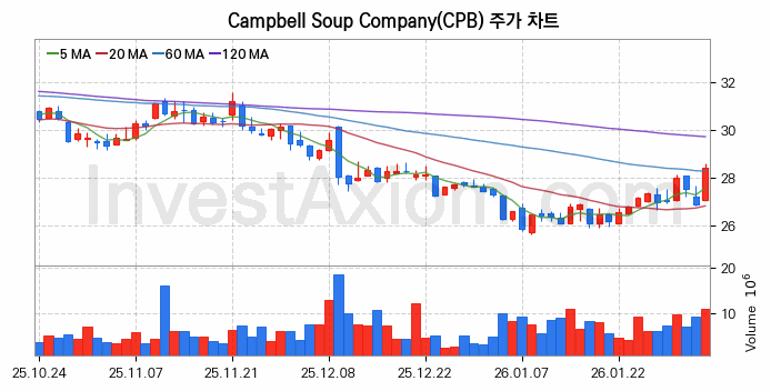 2026년도 첫 거래일인 2026년 01월 02일을 기준으로 분석 시점에서의 캠벨 수프 주가는 연초 주가 27.29달러 대비 약 4.15%에 해당하는 1.13달러 상승한 상태입니다.