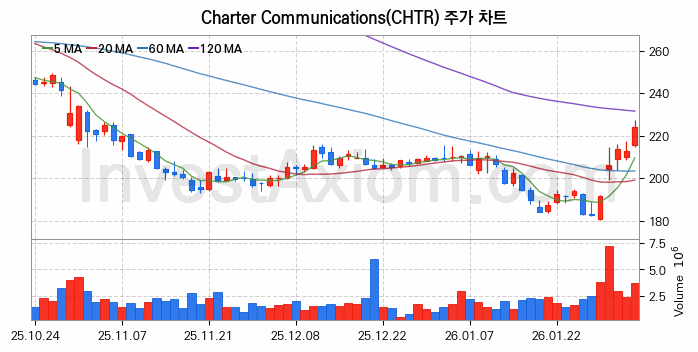 2026년 02월 04일, Charter Communications 주식 종목(CHTR)의 주가는 전일(212.74달러) 대비 11.43달러(약 5.38%) 상승한 224.17달러입니다.
