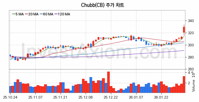 2026년도 첫 거래일인 2026년 01월 02일을 기준으로 분석 시점에서의 처브 주가는 연초 주가 310.05달러 대비 약 6.25%에 해당하는 19.39달러 상승한 상태입니다.