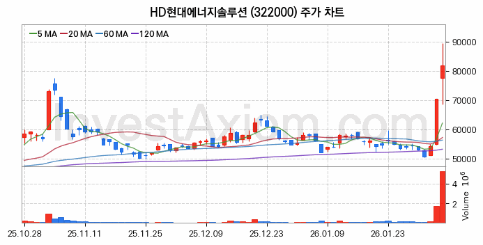 2026년 02월 05일, HD현대에너지솔루션 주식 종목(322000)의 주가는 전일(70500원) 대비 11400원(약 16.17%) 상승한 81900원입니다.