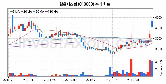 한온시스템 주가는 주 단위 첫 거래일인 2026년 02월 02일을 기준으로 주초 주가 3200원 대비 약 25.94% 830원 상승한 상태입니다.