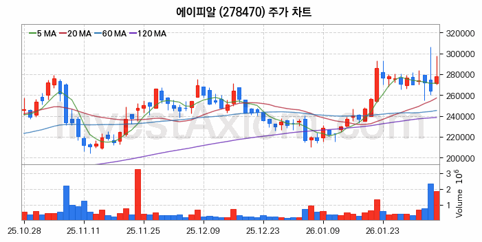 2026년 02월 05일, 에이피알 주식 종목(278470)의 주가는 전일(264000원) 대비 14000원(약 5.3%) 상승한 278000원입니다.