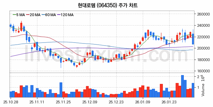현대로템 주가는 주 단위 첫 거래일인 2026년 02월 02일을 기준으로 주초 주가 214500원 대비 약 -3.5% 7500원 하락한 상태입니다.