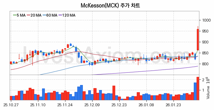McKesson 주가는 주 단위 첫 거래일인 2026년 02월 02일을 기준으로 주초 주가 846.51달러 대비 약 13.15% 111.28달러 상승한 상태입니다.