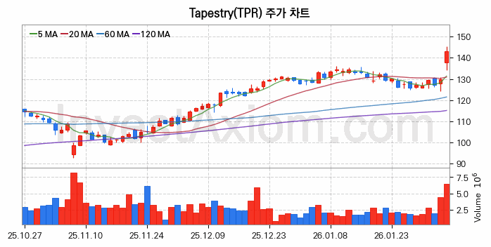 2026년 02월 05일, Tapestry 주식 종목(TPR)의 주가는 전일(129.91달러) 대비 13.27달러(약 10.21%) 상승한 143.19달러입니다.