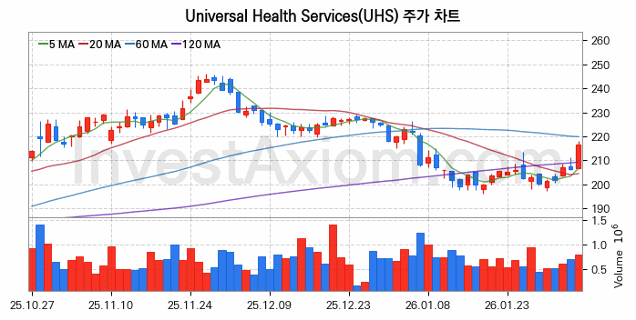 2026년도 첫 거래일인 2026년 01월 02일을 기준으로 분석 시점에서의 유니버셜 헬스 서비스 Class B 주가는 연초 주가 219.88달러 대비 약 -1.55%에 해당하는 3.41달러 하락한 상태입니다.