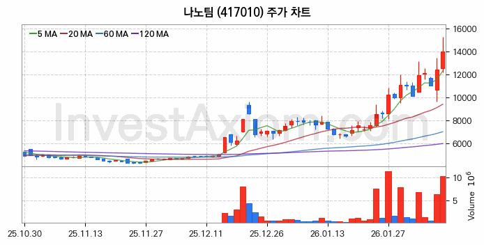 나노팀 (주식 종목 코드 : 417010) 주가 분석 내용의 기준 시점은 2026년 02월 09일이며, 분석 기준 시점으로부터의 주가 흐름 및 거래량 데이터를 바탕으로 분석 한 내용입니다.