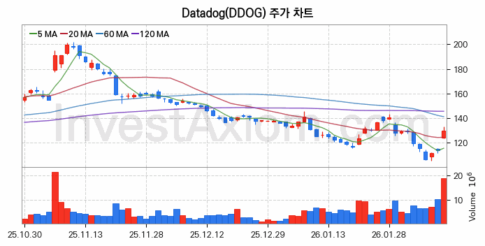 Datadog (주식 종목 코드 : DDOG, 데이터도그 Class A) 주가 분석 내용의 기준 시점은 2026년 02월 10일이며, 분석 기준 시점으로부터의 주가 흐름 및 거래량 데이터를 바탕으로 분석 한 내용입니다.