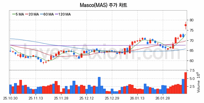 2026년도 첫 거래일인 2026년 01월 02일을 기준으로 분석 시점에서의 매스코 주가는 연초 주가 64.47달러 대비 약 20.71%에 해당하는 13.34달러 상승한 상태입니다.