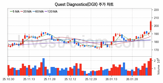 2026년도 첫 거래일인 2026년 01월 02일을 기준으로 분석 시점에서의 퀘스트 다이아그노스틱스 주가는 연초 주가 172.99달러 대비 약 18.7%에 해당하는 32.35달러 상승한 상태입니다.