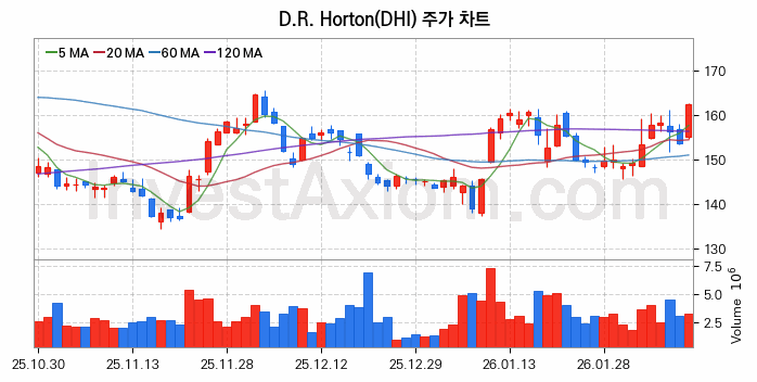 분석 시점 D.R. Horton 종목의 주가는 5, 10, 20, 60, 120 이동평균선 위에 형성되어 있습니다.