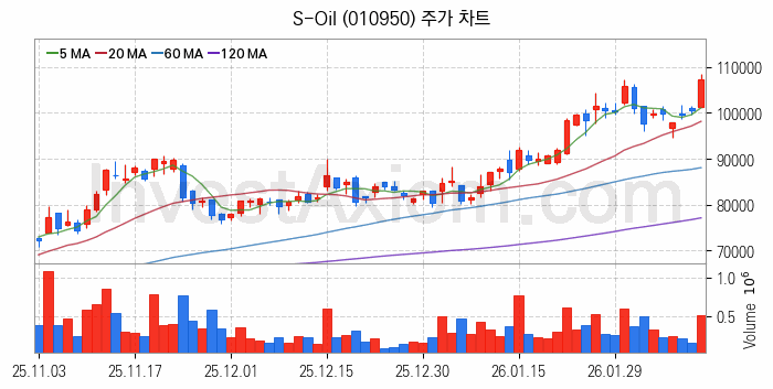 S-Oil(010950) 종목은 시가 101,200원으로 시작해 107,400원으로 마감했습니다.