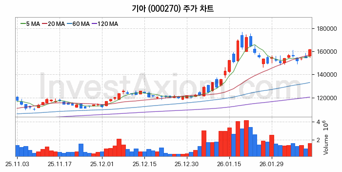 기아 주가는 주 단위 첫 거래일인 2026년 02월 09일을 기준으로 주초 주가 153800원 대비 약 5.2% 8000원 상승한 상태입니다.