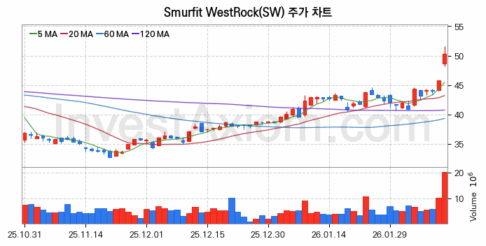 분석 시점 Smurfit WestRock 종목의 주가는 5, 10, 20, 60, 120 이동평균선 위에 형성되어 있습니다.
