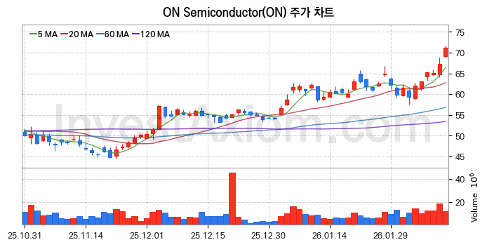 2026년도 첫 거래일인 2026년 01월 02일을 기준으로 분석 시점에서의 온 세미콘덕터 주가는 연초 주가 56.7달러 대비 약 25.54%에 해당하는 14.47달러 상승한 상태입니다.