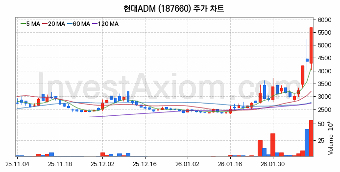 현대ADM (주식 종목 코드 : 187660) 주가 분석 내용의 기준 시점은 2026년 02월 12일이며, 분석 기준 시점으로부터의 주가 흐름 및 거래량 데이터를 바탕으로 분석 한 내용입니다.