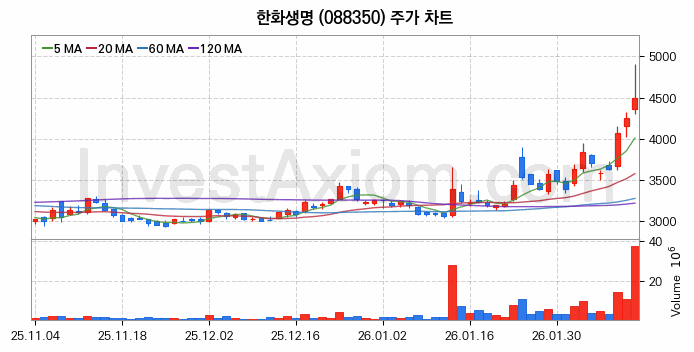 한화생명 주가는 주 단위 첫 거래일인 2026년 02월 09일을 기준으로 주초 주가 3635원 대비 약 23.66% 860원 상승한 상태입니다.
