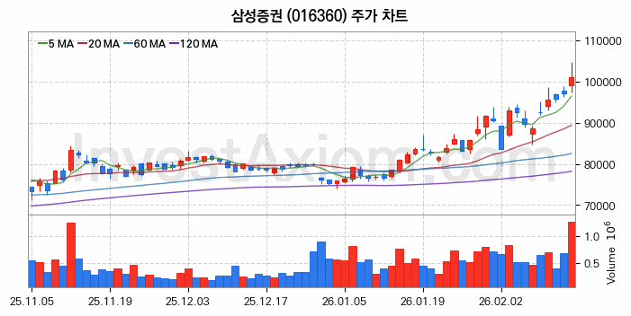 2026년 02월 13일, 삼성증권 주식 종목(016360)의 주가는 전일(97100원) 대비 3900원(약 4.02%) 상승한 101000원입니다.