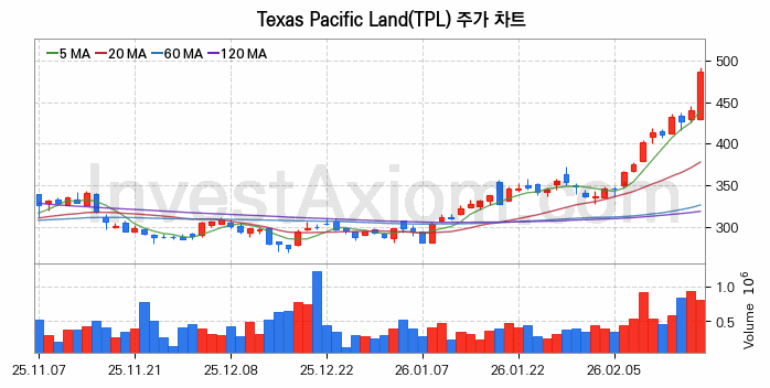 Texas Pacific Land 주가는 주 단위 첫 거래일인 2026년 02월 17일을 기준으로 주초 주가 426.42달러 대비 약 14.1% 60.13달러 상승한 상태입니다.