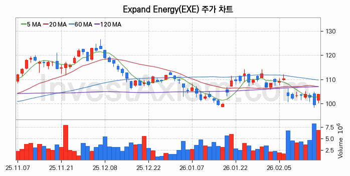 Expand Energy (주식 종목 코드 : EXE, 익스팬드 에너지) 주가 분석 내용의 기준 시점은 2026년 02월 19일이며, 분석 기준 시점으로부터의 주가 흐름 및 거래량 데이터를 바탕으로 분석 한 내용입니다.
