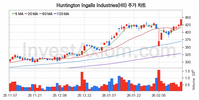 Huntington Ingalls Industries 주가는 주 단위 첫 거래일인 2026년 02월 17일을 기준으로 주초 주가 417.82달러 대비 약 6.06% 25.31달러 상승한 상태입니다.